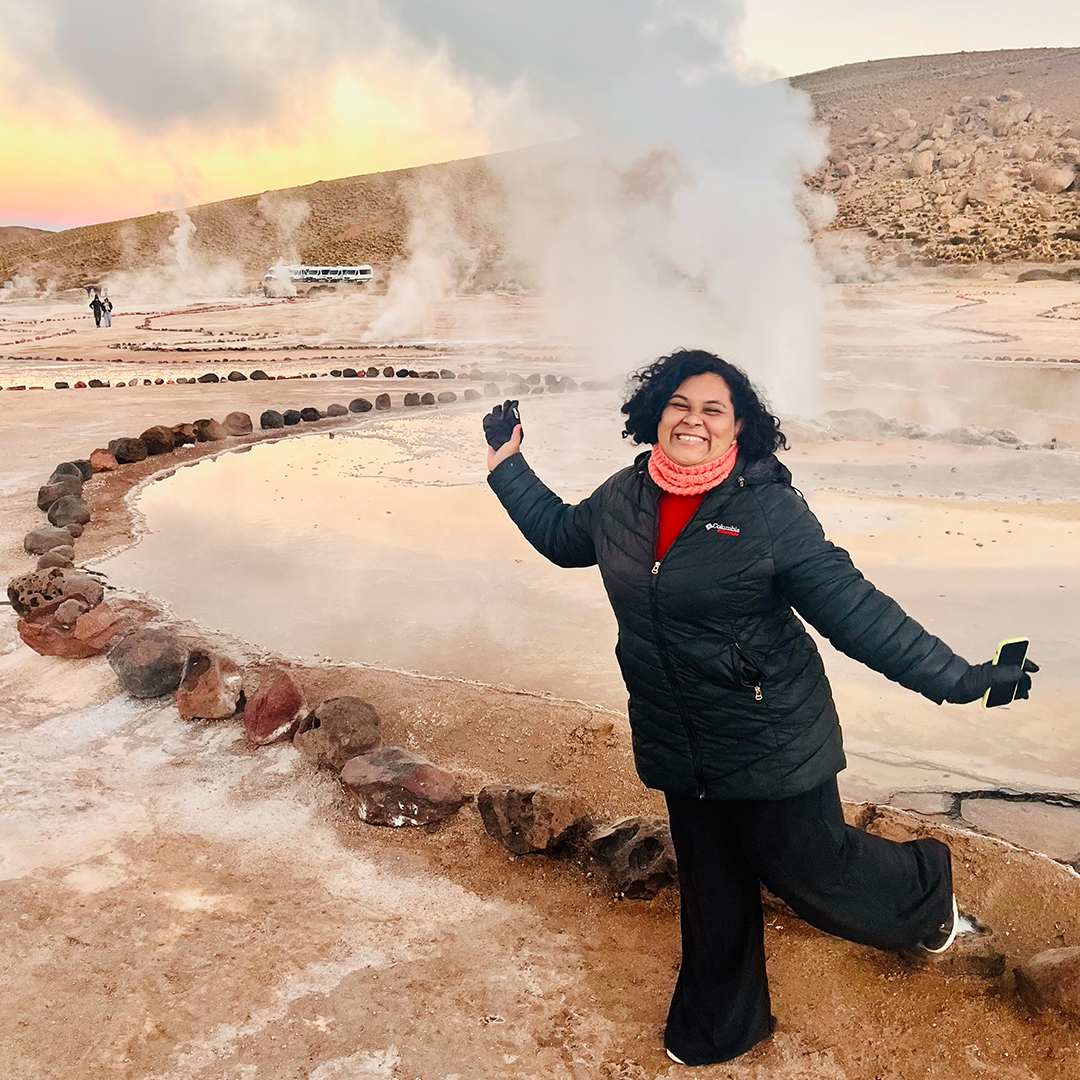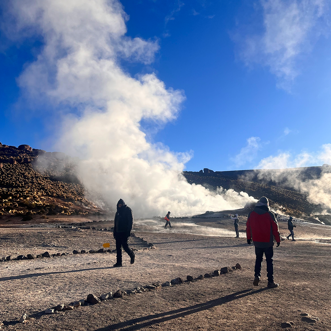O sol nasce iluminando os gêiseres e fumarolas que emergem do solo frio.